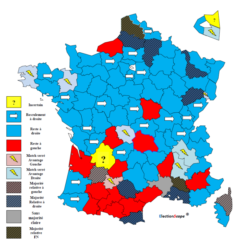 Ainsi, la carte simulée des départements donnait avant le premier tour : 22 basculements à droite, 40 départements stables à droite, 8 matchs serrés avec un avantage à droite contre 9 avec un avantage à gauche, 8 départements stables à gauche, un département (Gironde) avec une majorité relative à droite, 5 cas incertains et 2 cas (Bouches du Rhône et Vaucluse) sans majorité claire.